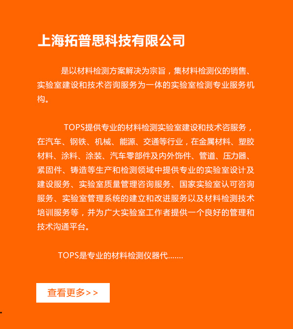 上海拓普思科技有限公司(The TOPS Lab System)是以材料檢測方案解決為宗旨,集材料檢測儀器的銷售、實驗室建設和技術咨詢服務為一體的實驗室檢測專業服務機構。